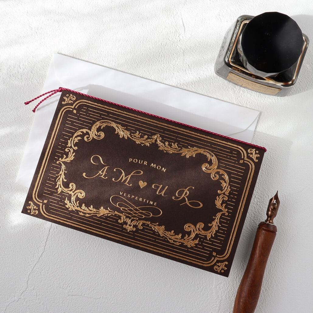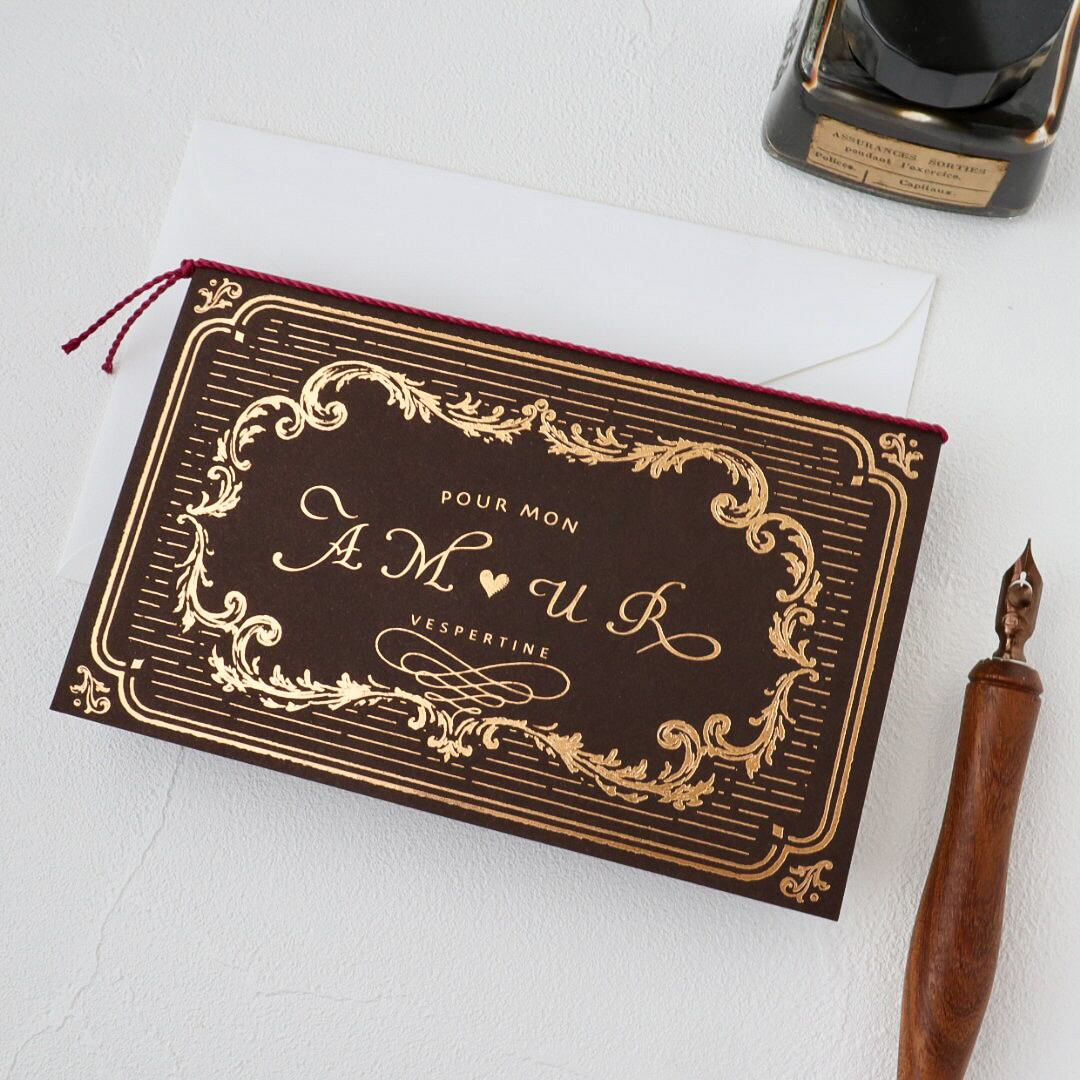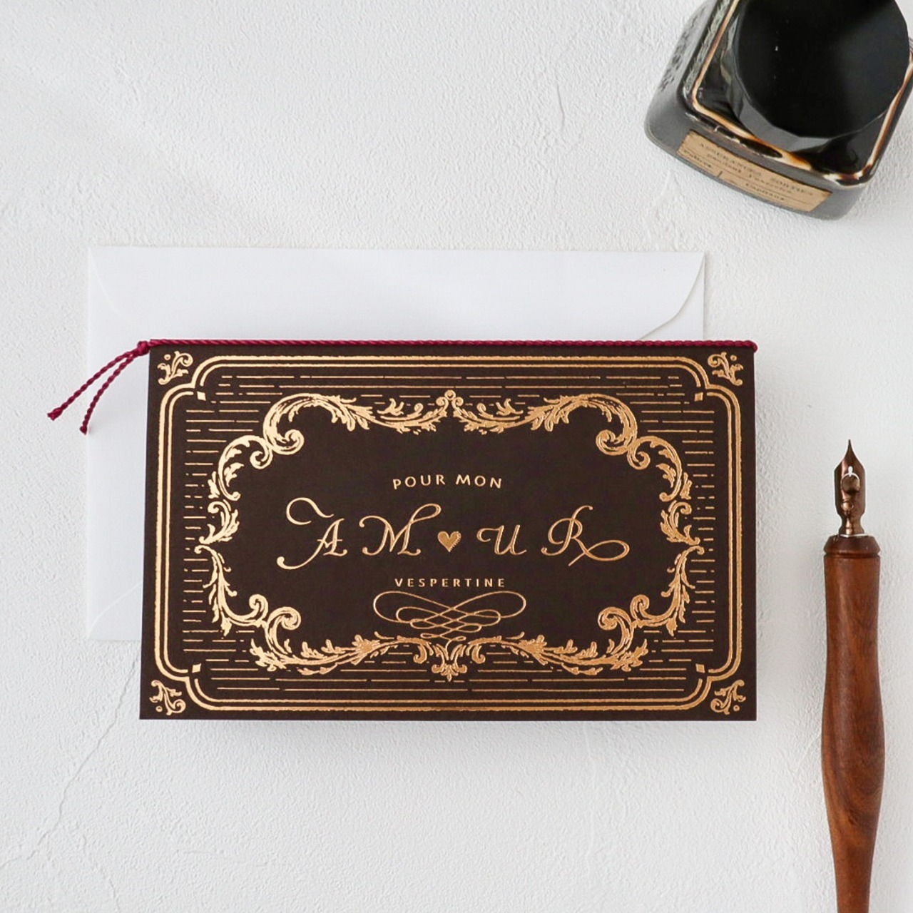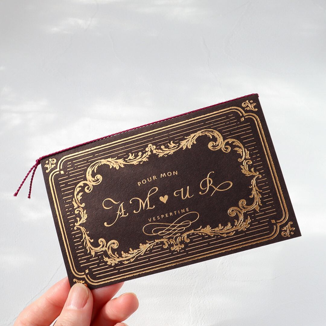 チョコレートのようにしっとりとした質感の紙にゴールドの箔押し加工を施しています。